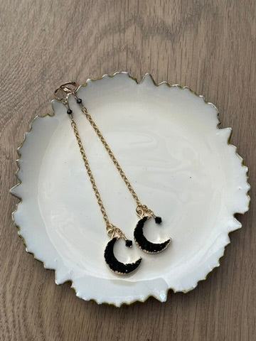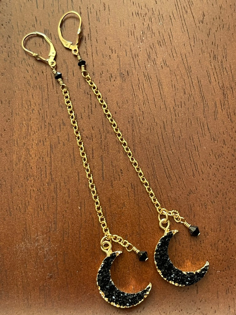 These stunning earrings feature black druzy crescent moons suspended from elegant gold fill chains, creating a perfect blend of celestial charm and modern minimalism. The black druzy moons have a textured, sparkling surface that beautifully catches the light, while small black crystal accents add extra shimmer.