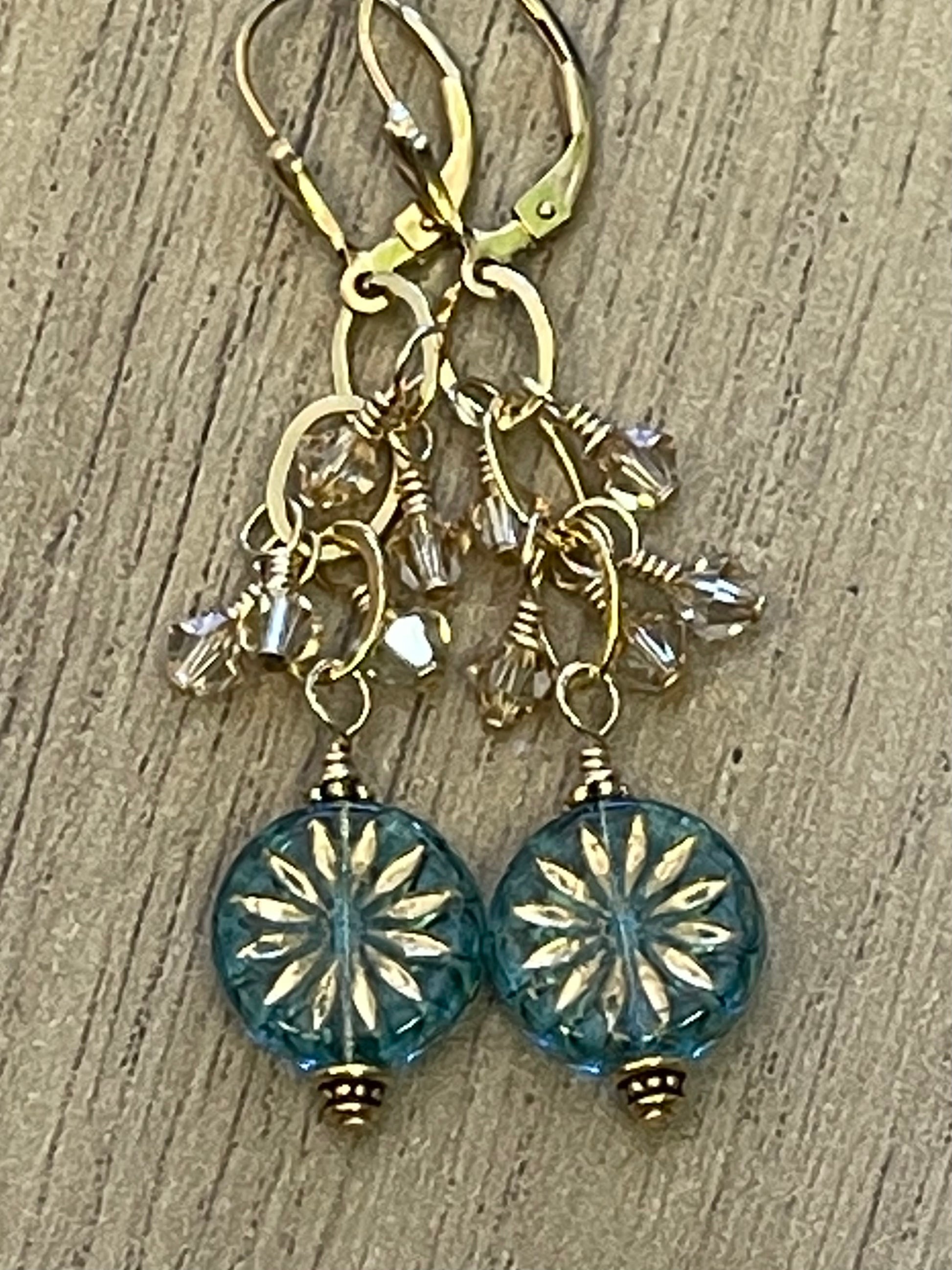 These elegant earrings feature gold-fill findings and exquisite glass beads with a detailed sunburst pattern, capturing the essence of sunlight. The glass beads reflect light beautifully, complemented by swarovski crystal dangles that add extra shimmer and movement.